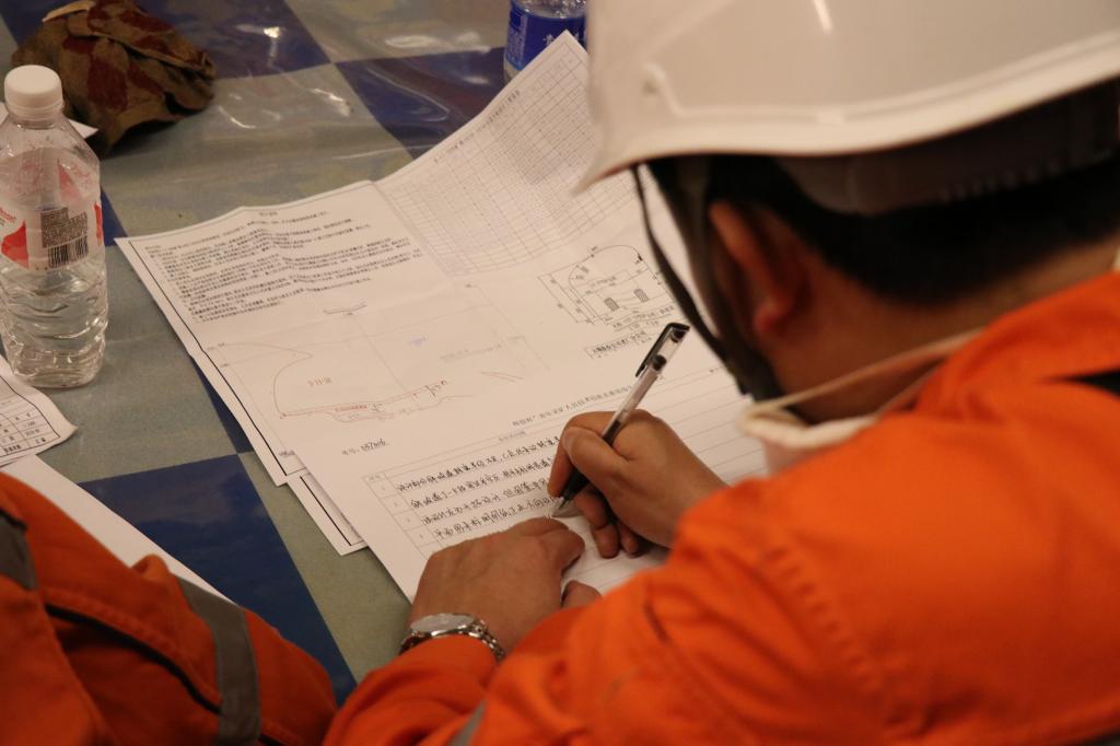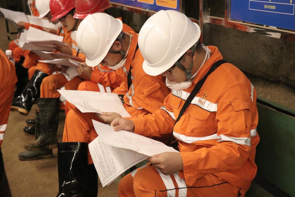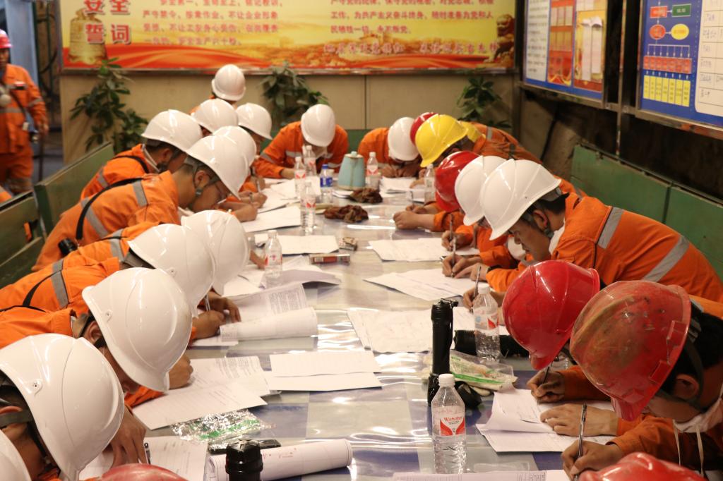 參賽人員經(jīng)過安全員入坑安全培訓(xùn)后前往本次考試地點塘子凹坑的主力采場3-11-5E,由于高手云集,最后一輪比賽標準更高,要求更嚴。比賽現(xiàn)場,選手們信心滿滿,躍躍欲試,氣氛嚴肅卻又不失親切。拿到考題后認真勾畫,緊抓重點。在迎頭上,選手們沉著迎戰(zhàn),從容不迫,認真排查現(xiàn)場與施工單上“異樣”,反復(fù)查看,爭取不漏任何細節(jié)。
