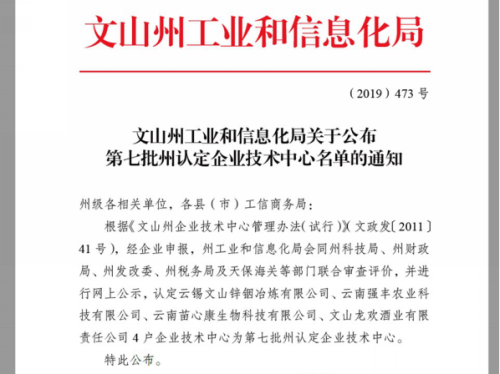 近日,云錫文山鋅銦冶煉有限公司同云南強豐農業科技有限公司、云南苗心康生物科技有限公司、文山龍歡酒業有限責任公司4家企業獲第七批州認定企業技術中心榮譽稱號。