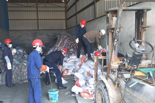 為確保銅渣順利發運,云湘黨支部急生產之所急,迅速組織由黨員和業務骨干組成8人突擊隊,于11月21日、22日投入到緊張裝卸任務中。在場地狹窄、大型設備施展不開等問題下,只能依托人工背運到叉車,再通過叉車轉運到卡車,銅渣一袋凈重30公斤,需要來回翻騰兩次,沒開工多久,突擊隊員已汗流浹背,氣喘吁吁。盡管如此,突擊隊員一直緊咬牙關,不顧灰塵,不顧呼出的熱氣模糊了眼鏡,不顧大滴的汗水從安全帽流出,一鼓作氣把60多噸銅渣及時補裝到位,保證銅渣銷售外運工作正常開展。