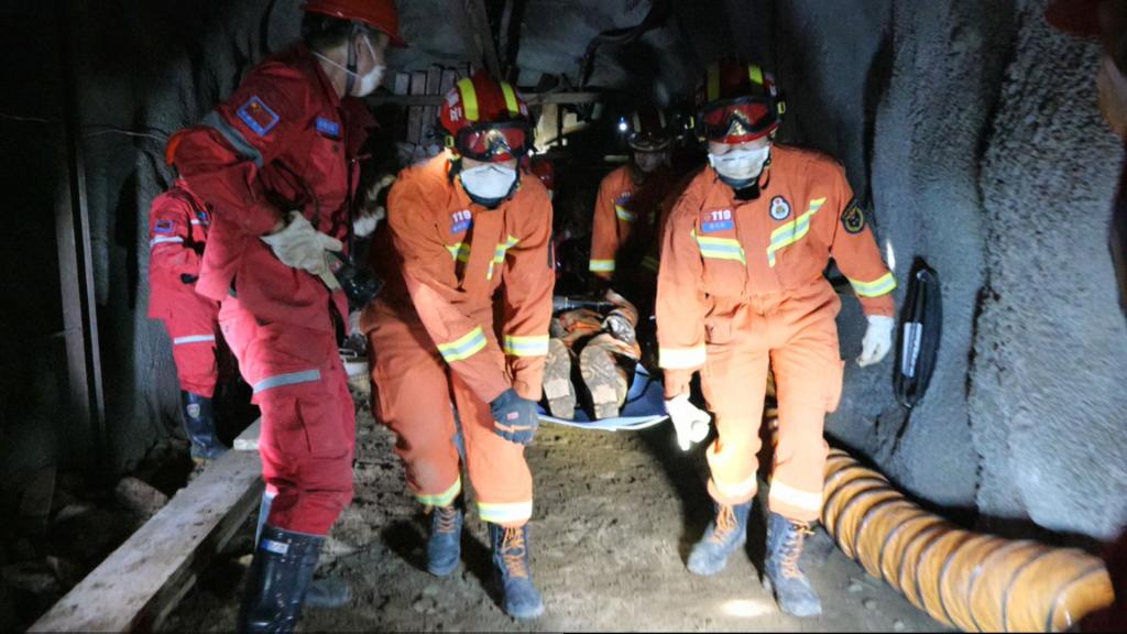 在制定科學救援方案后,救援隊員佩用正壓式氧氣呼吸器,攜帶雷達生命探測儀、熱成像儀、氣體檢測儀、對講機和個人防護裝備等進入巷道冒頂區域進行現場安全確認和被困人員搜尋,經雷達生命探測儀搜尋顯示3名被困人員有生命體征,但現場一氧化碳濃度78ppm超標,需對救援現場進行機械通風,巷道冒頂嚴重,需進行支護。在把現場搜尋情況及時層層匯報后,救援隊員攜帶風機、風帶、支護材料和破拆工具等設備分兩個組先后進入事故現場,照明、通風、巷道支護作業隨即鋪開。準備工作就緒后,現場救援人員采用《礦山(隧道)事故救援聯絡信號》聯絡被困人員,救援隊員用細木棍將系有食品、水的導繩從管道送給受困人員,并安撫受困人員情緒。不料,在快速的支護推進中,突然地壓活動頻繁,頂板再次冒落,救援隊在同受困人員保持聯系的同時,只得暫時退至安全區域待命。4名專家技術人員再次進入事故現場勘察和評估,經專家技術組確認現場地壓穩定,可以向前支護,搶險救援組再次進入現場進行向前支護、清理巷道。鄒文鴻等領導在現場指揮著救援工作,要求救援人員要時刻留意事故現場環境,保證自身安全才能解救他人。經救援人員的共同努力,生命通道成功打通,被救出的3名受困人員均無大礙,已在醫務人員的護送下離開事故現場,去往就近醫院接受系統的檢查和治療。經救援隊現場搜尋確認已無受困人員,鄒文鴻下令各工作組撤離事故現場。