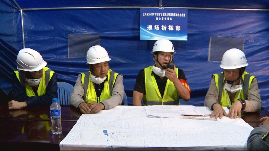 此次演練方式采取實地演練,即在實際環境下組織專項實兵演練,并采取單頻觀摩的方式進行觀摩。“井下發生冒頂了,井下發生冒頂了,大家快撤,大家快撤……”井下值班長大聲叫到。演練模擬大屯錫礦1360坑450米探礦平巷掘進迎頭外50米左右突然發生巷道頂板冒頂坍塌,并將巷道內的風管、水管、電話線、供電線路砸斷,巷道被垮落的支護、巖石堵塞,長度約10米左右,通過查看出入井記錄和人員定位系統,核實單班入井人員共26人,安全出井23人,3名人員被困。大屯錫礦逐級上報,州政府應急辦接報后遂啟動《紅河州非煤礦山生產安全事故應急預案》,同時責成各相關部門、單位和救援隊趕赴事故現場展開救援。包括現場指揮、搶險救援、醫療衛生、物資保障在內的9個工作組經短暫集結了解險情后,分別領命向事故地點進發。與此同時,現場指揮部指揮長、個舊市副市長鄒文鴻等領導,前往現場指揮部指揮救援工作的開展。