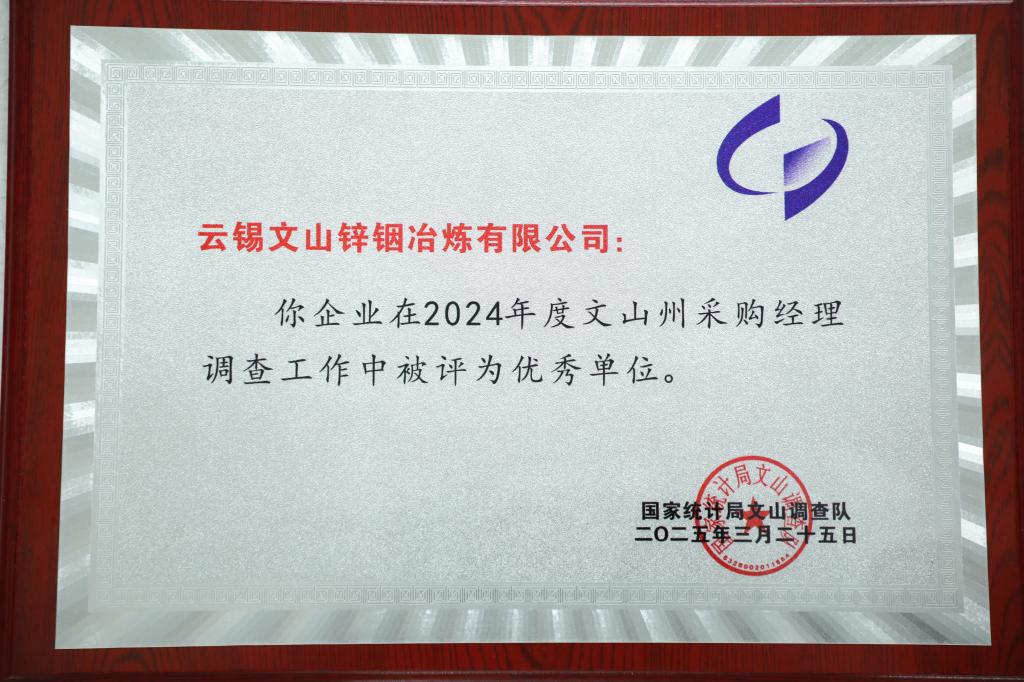 近日,國家統計局文山調查隊公布2024年度文山州采購經理調查工作優秀單位評選結果,文山鋅銦公司憑借在采購經理調查工作中的突出表現,獲“2024年度文山州采購經理調查工作優秀單位”稱號。