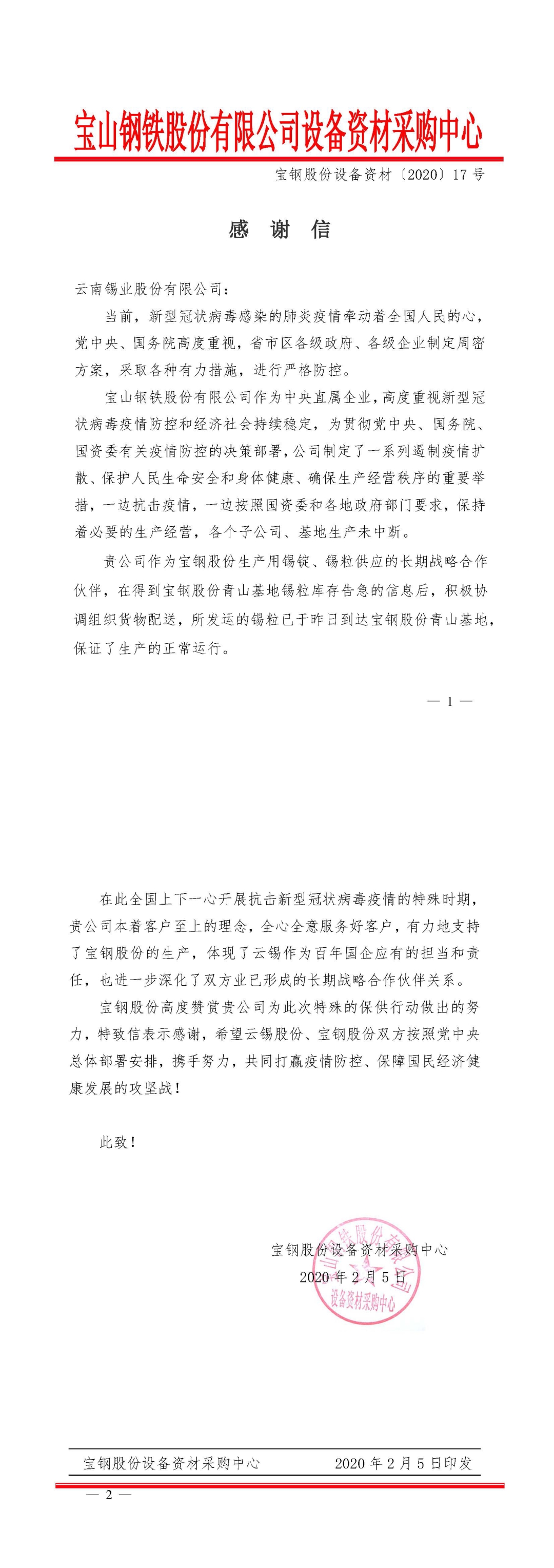 在存在諸多不確定因素的情況下,公司決定抱著嘗試的心態進行配送,盡最大努力確保供貨。最后,在明確疫情期間需注意事項,確保人員安全的前提下,配送貨車于2月2日從昆山出發,最終順利通過檢查關卡,于2月4日將貨物安全交付武鋼新日鐵工廠,配送車輛也在武鋼的協助下順利離開武漢,返往昆山。公司在疫情期間采取特殊方式完成貨物配送,得到了客戶的高度認可,寶鋼表示,患難見真情,感謝云錫對寶鋼原料保供的鼎力支持,并為此專門向錫業股份發來了感謝信。