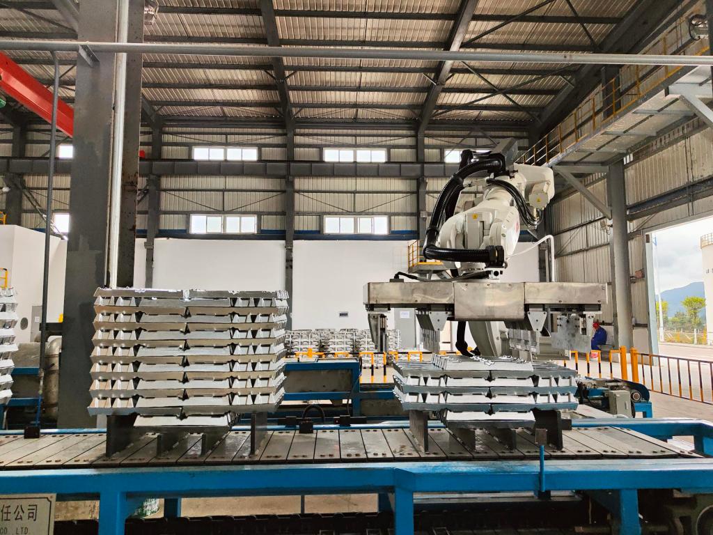 文山鋅銦年產(chǎn)3萬噸壓鑄鋅合金項目是云錫文山片區(qū)兩公司“倍增翻番”計劃項目之一,也是文山州2022年“四個三十”重點建設(shè)項目之一,同時也是公司依托年產(chǎn)10萬噸鋅冶煉熔鑄系統(tǒng)高效穩(wěn)定運行基礎(chǔ)優(yōu)化升級實施項目,采用先進(jìn)、環(huán)保、節(jié)能的合金工藝和設(shè)備,主體設(shè)備選用“有芯感應(yīng)爐+可傾有芯感應(yīng)爐+電阻保溫爐”,配套液壓升降式加料裝置,合金爐自帶稱重保障精準(zhǔn)配料,探針聯(lián)鎖穩(wěn)定控制出液流量,機器人高效自動扒皮,風(fēng)冷搭配均水噴淋,激光打碼自動碼垛、打包、稱重、貼簽,全流程自動化高,控制精準(zhǔn),操作規(guī)范,精選99.996%以上鋅片搭配99.85%重熔鋁錠和99.95B鎂錠作為合金錠生產(chǎn)原料,與現(xiàn)有工藝實現(xiàn)閉環(huán),形成了一套完整的環(huán)保、低耗、資源綜合利用的冶煉產(chǎn)業(yè)鏈體系。該項目于2022年8月8日開工,10月9日點火烘爐,10月27日投料一次性產(chǎn)出合格產(chǎn)品,其產(chǎn)品表面光滑平整、斷面晶粒均勻、金屬質(zhì)感強、錠垛規(guī)整,物規(guī)質(zhì)量、化學(xué)成分穩(wěn)定,各項指標(biāo)明顯優(yōu)于國標(biāo)。