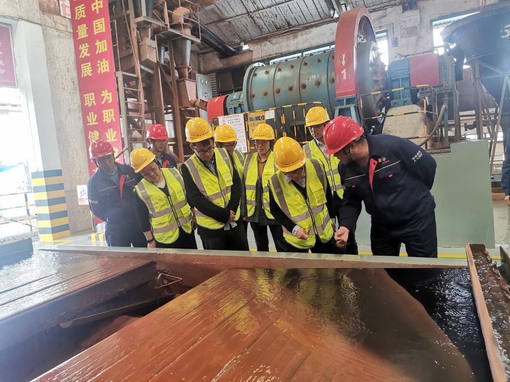 經過安全教育培訓后,在選礦車間各支部書記的帶領下一行人走進選礦車間深入了解錫銅多金屬選礦工藝,在4000噸/日浮選、重選、氧化礦14棟、精選300噸/日生產現場,工段領導先后介紹了選礦工藝流程、選別礦種、選礦自動化智能化,特別就4000噸/日浮選專家控制系統、三維智能信息綜合管控平臺、300噸/日合格錫回收率攻關項目及目前推進的4000噸/日磨礦專家控制系統進行介紹,并對來賓們提出的選礦工藝、流程等疑問進行解答,在錫強有我手繪文化墻前,一幅幅栩栩如生的手繪墻畫讓參觀人員頻頻駐足。隨后,一行人前往余歡技能大師工作室與余歡進行座談,對技能大師工作室的建設情況進行了解,余歡圍繞氧重選工段工藝流程和磨礦機日常操作檢查維護等情況進行交流。