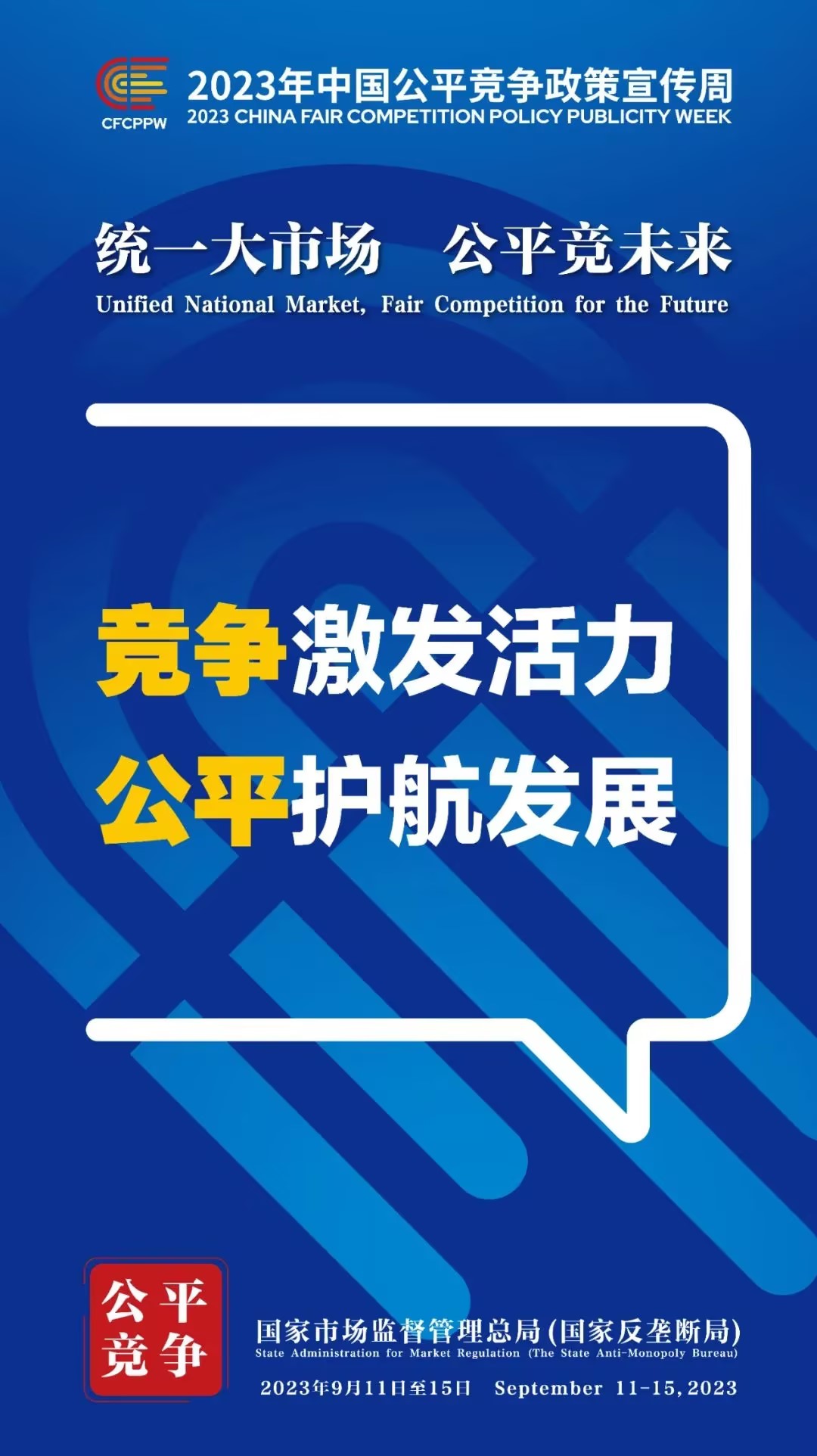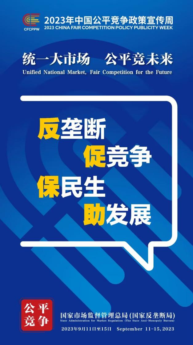 9月11日至15日為2023年中國公平競爭政策宣傳周,主題是“統一大市場 公平競未來”。旨在大力加強公平競爭宣傳倡導,讓公平競爭理念更加深入人心、公平競爭文化更加蔚然成風,為加快建設全國統一大市場、優化市場化法治化國際化一流營商環境、推動高質量發展營造良好社會氛圍。